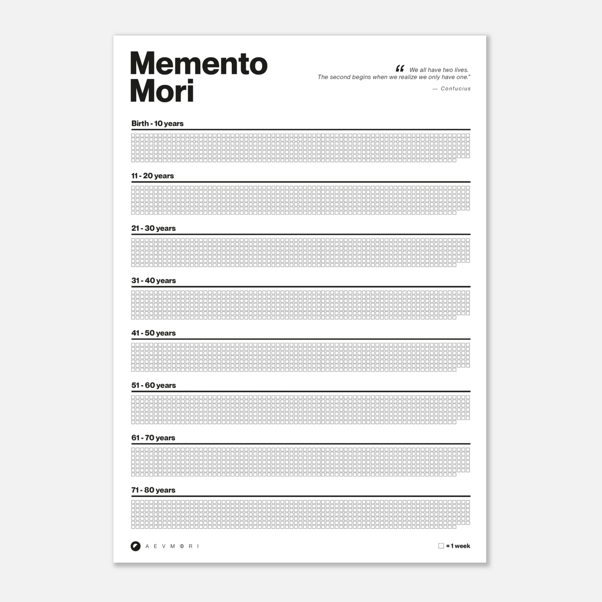 The AEVMORI Memento Mori Life Calendar is more than a poster. It is a mindset tool. Each square represents one week of your life, helping you stay aware of your time, focused on what matters, and motivated to live deliberately.